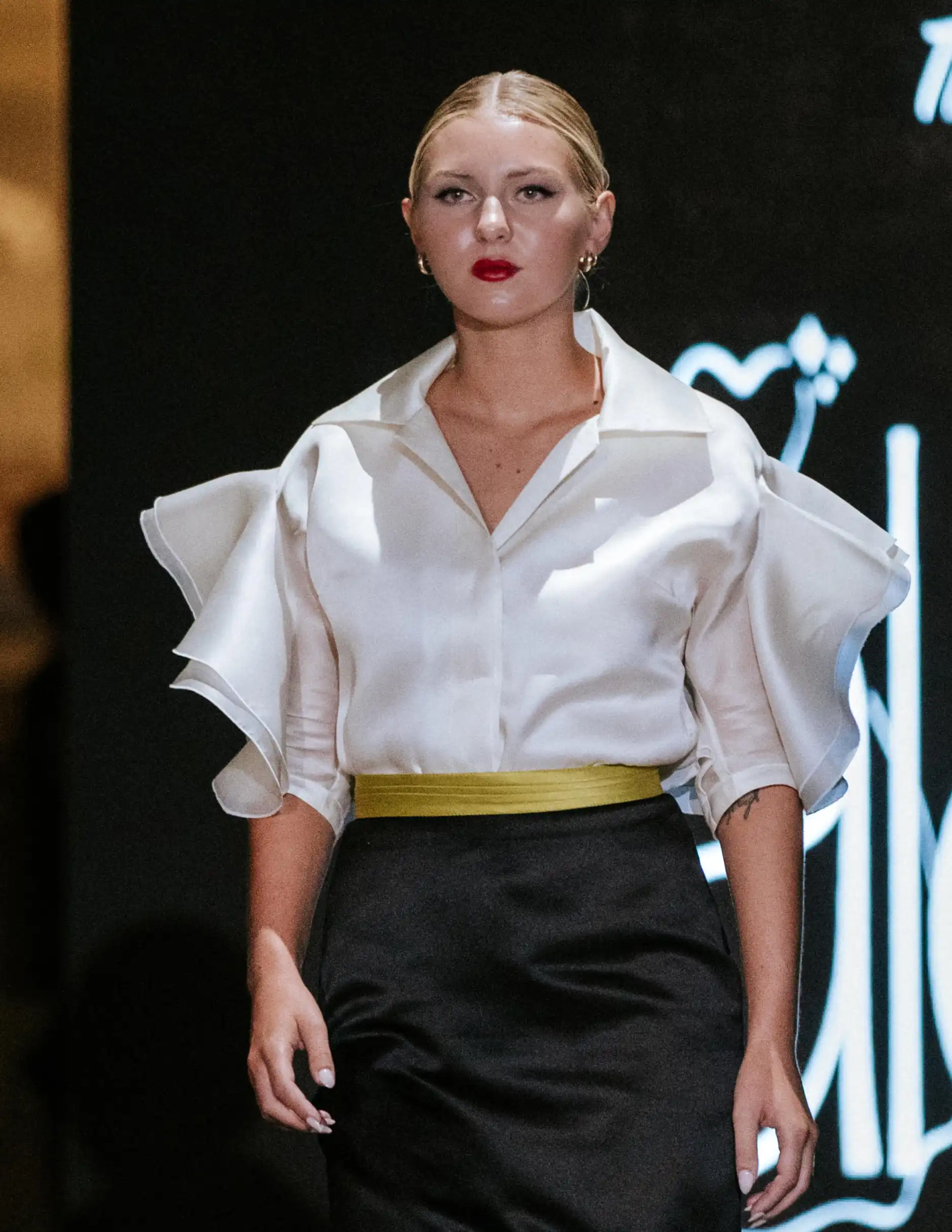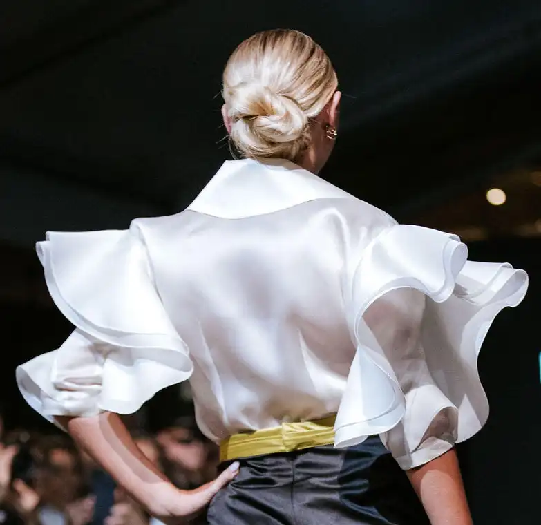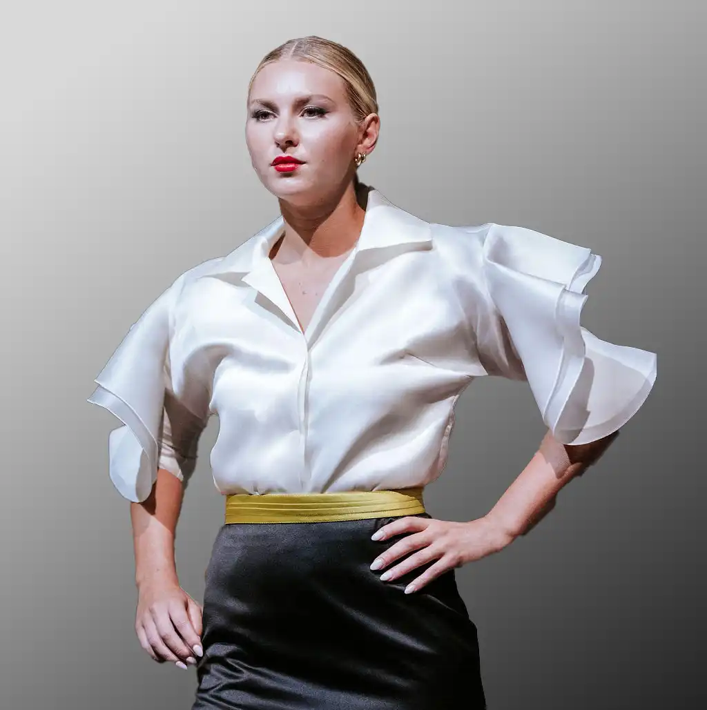 Design Details: Semi-fitted cut that flatters your silhouette, featuring double ruffle sleeves as the focal point